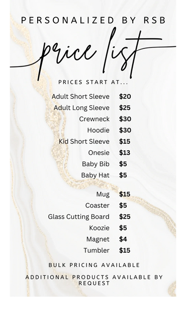 Personalized by RSB was founded in 2025 with the goal of providing fun and customized products for our customers. With a full range of embroidery, sublimation printing, and heat vinyl pressing available, we are equipped to bring your personal and commercial projects to life.